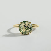 This ring features a striking moss agate at its center, a stone known for its unique, intricate patterns that resemble moss or foliage. The moss agate is elegantly set in a polished gold band, highlighting the natural beauty of the stone.